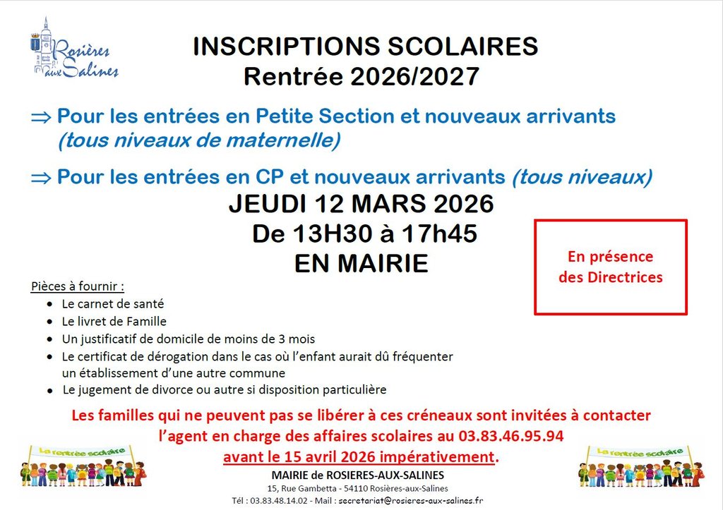 ⚠ Les familles qui ne peuvent être présentes sont invitées à contacter l’agent en charge des affaires scolaires au 03.83.46.95.94 avant le 15 avril 2026.