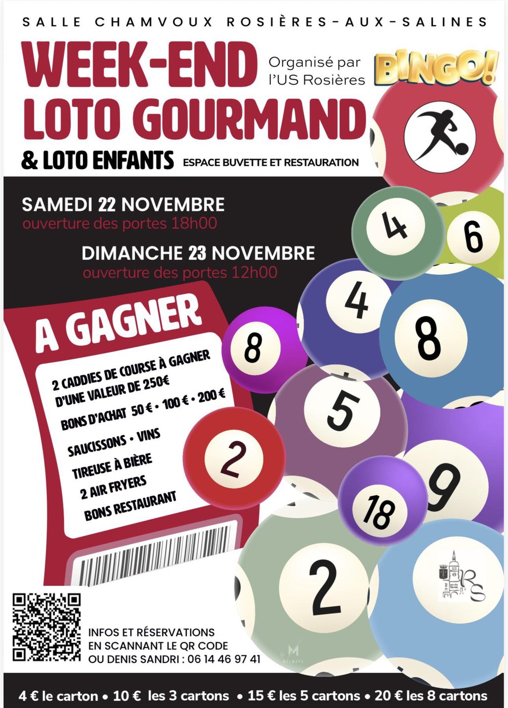 L'US ROSIERES FOOT organise deux lotos gourmands les samedi 22 et dimanche 23 novembre 2025 à la salle polyvalente de la commune.