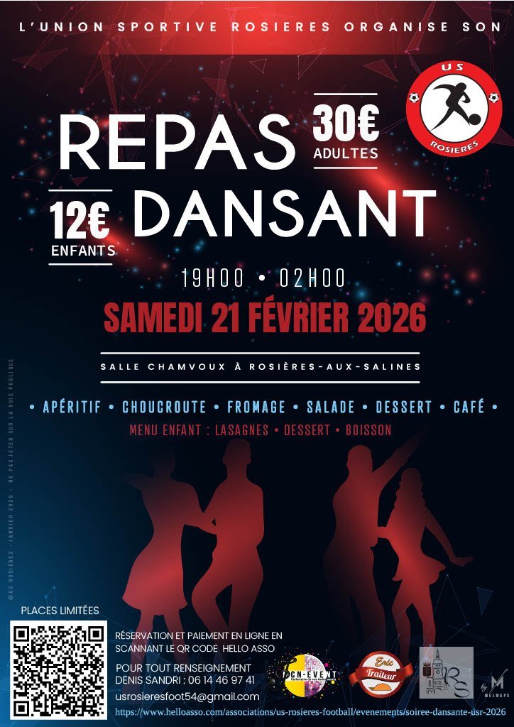 L'US ROSIERES FOOT organise sa soirée dansante annuelle à la salle CHAMVOUX, rue Yvon Malpièce le samedi 21 février 2026.