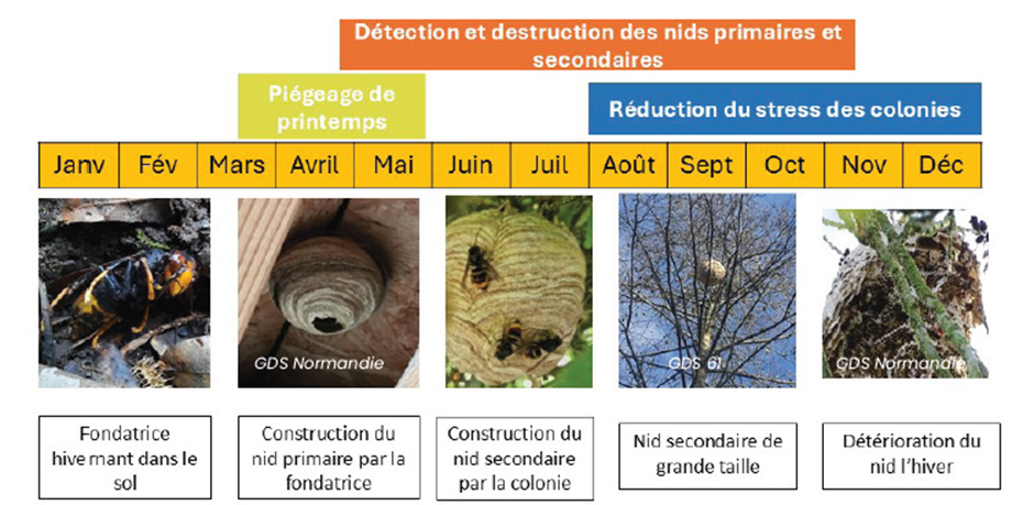 Détruire ces nids ne suffit pas. Il faut lutter dès février/mars 2025 contre la construction de nouveaux nids par les frelons FONDATRICES, qui se sont cachées durant l’hiver, et éviter ainsi la reproduction.